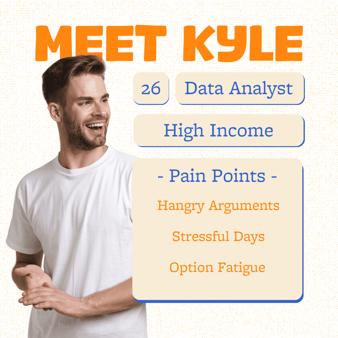 Kyle is a busy professional with a high income, living with his girlfriend of two years. He’s planning to propose but constantly struggles with the one thing he can't control: deciding where to eat. Their 'hangry' arguments over small things like blankets and trash get in the way of their otherwise smooth relationship. Kyle is looking for a simple, stress-free way to choose a restaurant that satisfies both their cravings, so he can focus on making his personal life as calm and happy as possible, especially before popping the question.