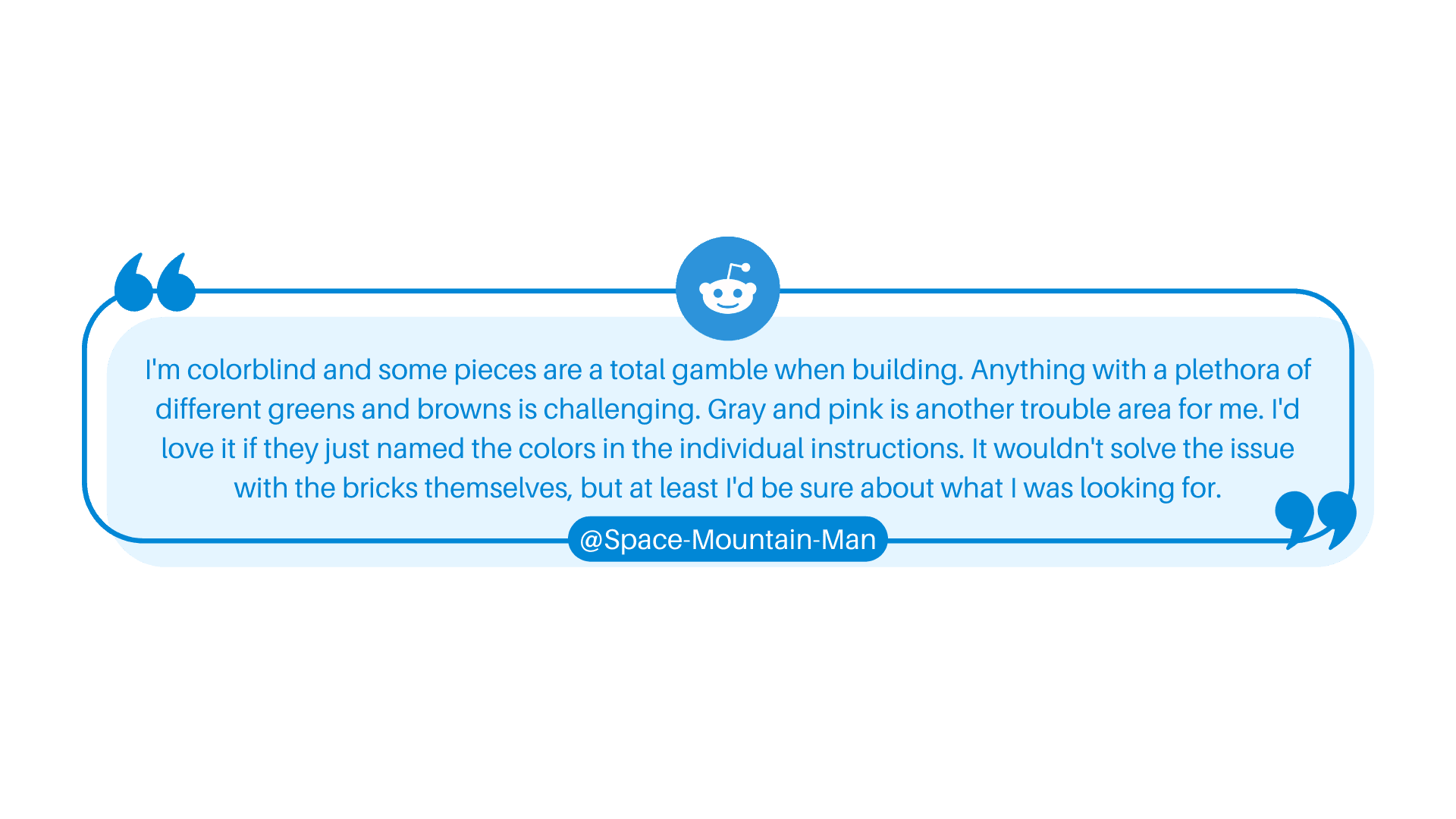 LEGO has a long history of thoughtful inclusion, from Braille Bricks to initiatives supporting diverse builders. But social listening reveals a gap: colorblind fans routinely express frustration that instructions and pieces rely too heavily on hue, not form.